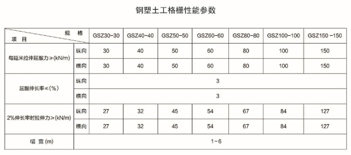 鋼塑復(fù)合土工格柵是用聚丙烯、聚氯乙烯等高分子聚合物經(jīng)熱塑或模壓而成的二維網(wǎng)格狀或具有一定高度的三維立體網(wǎng)格屏柵。由于塑料土工格柵在制造中聚合物的高分子會隨加熱延伸過程而重新排列定向,加強(qiáng)了分子鏈間的聯(lián)結(jié)力,達(dá)到了提高其強(qiáng)度的目的。其延伸率只有原板材的10%~15%。如果在土工格柵中加入炭黑等抗老化材料,可使其具有較好的耐酸、耐堿、耐腐蝕和抗老化等耐久性能。